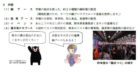 京都岩手県人会事務局です。 大槌町では、京都中央卸売市場第一市場のご協力をいただき、 同所で開催される「鍋まつり」において、三陸産わかめの試食、 無料配布といった宣伝の機会をいただけることとなりました。 お時間のある方は是非お出かけ下さい。 1 日時 平成26年11月23日(日・祝)午前11時から午後2時まで(雨天決行) 2 場所 京都市中央卸売市場第一市場 水産卸売場(京都市下京区朱雀分木町80番地) 3 内容 (1)鍋ブース 市場の食材を使った,約20種類の鍋料理の販売 (2)販...
