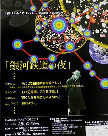 京都岩手県人会事務局です。 宮沢賢治原作「銀河鉄道の夜」のミュージカル KARAKORO STAGE2014 が上演されます。 日 時:2014年5月5日(月・祝)開演17時30分 5月6日(火・休)開演14時30分 会 場:ピッコロシアター・大ホール 尼崎市南塚口町3-17-8 入場料:有料 主催とお問い合わせ先 一般社団法人からだとこころの出会いの会 電話:06-4806-4355 / 080-5302-8463 e-mail:office@karakoro.org HP:http://karakoro/org