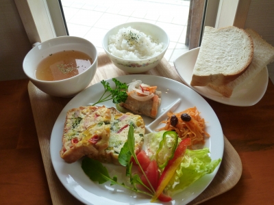 JUGEMテーマ:カフェ@京阪神夏野菜もたっぷりケーク・サレ キャロットラペ ポテトサラダ 季節のスープ パンorごはん