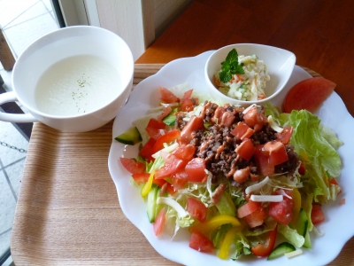 JUGEMテーマ:カフェ@京阪神 6月7日〜14日 はなちゃんの気まぐれランチ お野菜たっぷりタコライス サラダ スープ、ひんやりスープ