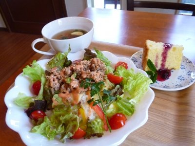 JUGEMテーマ:カフェ@京阪神 いろどりケーク・サレ サラダ キャロットラペ 冷たいスープ ごはんorパン