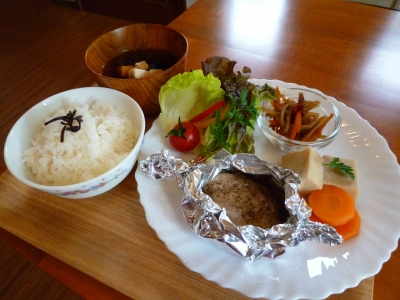 JUGEMテーマ:カフェ@京阪神7月5日〜はなちゃんの気まぐれランチメニュー ほっこり和食 選べるホイル焼き きんぴらごぼう 高野豆腐の煮物 ミニサラダ おみそ汁、ごはんorパン