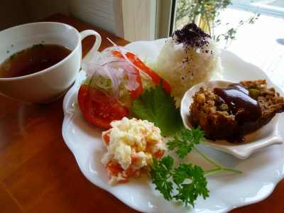 JUGEMテーマ:カフェ@京阪神 今週のはなちゃんの気まぐれランチは、おやさいのミートローフサラダ、ポテトサラダ、ごはんorパンスープ ジュリアンスープ