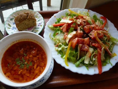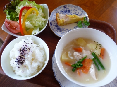 JUGEMテーマ:カフェ@京阪神 今週は、ほっこり和食塩鮭のけんちん汁 根菜類もたっぷり鶏そぼろごはんサラダ、あえものor煮物