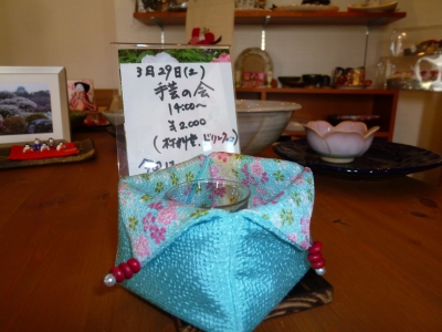 JUGEMテーマ:カフェ@京阪神 手芸の会は、3月29日(土)14時から今回は、春らしいこものいれを作ります。材料費、ドリンク付き、2000円予約電話 Caféは*な 06ー7175−2873までどうぞ!
