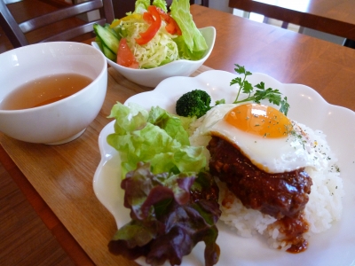 JUGEMテーマ:カフェ@京阪神春のロコモコごはん 煮込みハンバーグの目玉焼きのっけサラダ ポテトサラダ筍のスープ春のメニューでお待ちしてま〜す