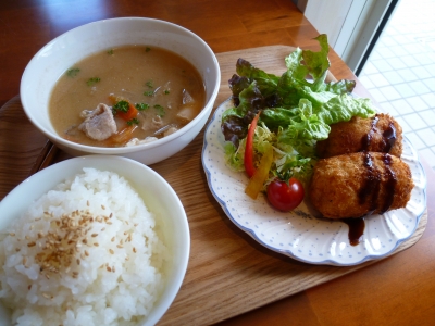 JUGEMテーマ:カフェ@京阪神はなちゃんランチは、具だくさんの豚汁はなちゃんの手作りコロッケ、+さけフライさらだごはんorパンほっこり和食で、おまちいたしております。