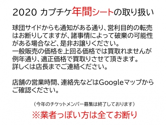 JUGEMテーマ:広島駅前の質屋さん (有)三益商事 こんにちは。 今年最も厳しい寒波にやられてませんか? 大丈夫でしたか? 広島駅前は雪が一瞬だけ舞っておりましたが、積もることなく日常生活 に影響はありませんでした。 県北部では久々にドカ雪が降ったそうで、大好きなスキー場にとっては 一安心?と思っておりましたが、アサヒテングストンさんが自己破産を 発表されてました。泣。 ほんと厳しい時代になりました・・。 今日はカプチケ年間指定シートの取り扱いについてです。 結論から...
