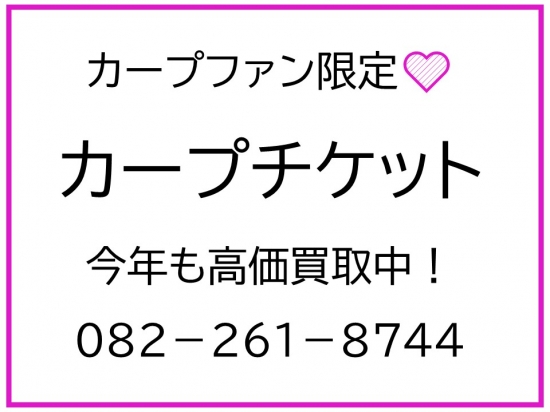 JUGEMテーマ:広島駅前の質屋さん (有)三益商事 おはようございます。 書き上げたデータが消えちゃって少し凹んでおります。 要点だけを書き込みます。 それから、ご応募いただいた方には返事もできなくて申し訳ないです。 後日必ずお返事させていただきますので、ご安心ください。 今年も営利目的のカープチケット販売は行いません。 あくまでファンとファンをつなぐ事を目的にチケットを扱うことにしま す。とはいえ、チケット入手には大変な思いをされているのも現実です。 出来るだけ低...