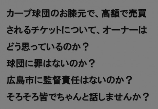 JUGEMテーマ:広島駅前の質屋さん (有)三益商事 こんにちは。 カープの快進撃に全国のファンが喜びまくっておられるのでしょうね。 そこだけ切り抜けば手放しで嬉しい話でございます。 が、カープ球団のお膝元の年長者の方々は少し複雑な思いで観戦してい るようです。 カープ球団のチケット販売方法が完全に失敗した結果、多くのチケット 難民を作る結果となりました。 広島弁で交わされる井戸端会議の内容を、少し丁寧な表現に直したのが 上のようなご意見です。 ごもっ...