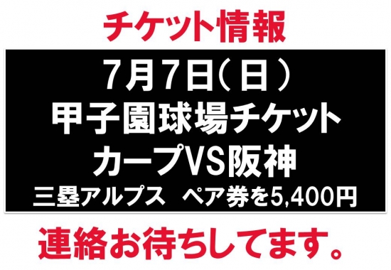 JUGEMテーマ:広島駅前の質屋さん (有)三益商事 おはようございます。 昨日の事ですが、ウチのメンバーさんが都合で行けなくなったチケット を販売して欲しいと連絡がありました。 場所は甲子園球場です! ご連絡お待ちしております。