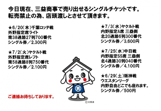 JUGEMテーマ:広島駅前の質屋さん (有)三益商事 こんにちは。 まだ6月と言うのにお暑〜ございます。 球場へ足を運ばれるファンの皆様、水分補給はこまめにされ体調の管理 にはお気をつけられますように・・・。 と、言っても球場に行けるだけ良いよね!方も沢山いらっしゃいます。 実際、問い合わせも多くなっております。 期待に応えられず申し訳ないですが、若干売れ残ってるシングル券のご 案内させていただきます。 上記金額は手数料を含んでおりますが、店頭渡しのみ対応とさせて...