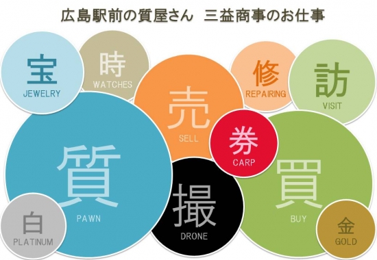 JUGEMテーマ:広島駅前の質屋さん (有)三益商事 こんにちわ。 2021年もすごい速さで月日が過ぎております。 ボーっとしているとあっという間に1年が過ぎちゃいます・・。 と言う事で、改めて三益商事を知って使って欲しいなぁ〜との思いから 三益のお仕事をイメージしてほしくこんな・・。 いやイメージ出来ない?あっさり敗北感がにじみ出ますが、質屋さんの お仕事を少しだけでも分かって頂ければ幸いです・・・。 細かいこと言うともう少しありますが、今年もお役に立てる事...