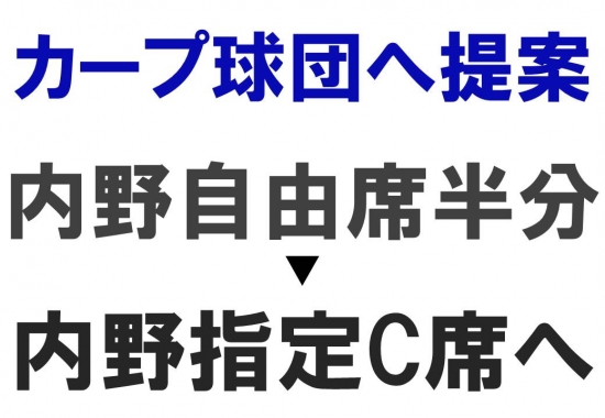 JUGEMテーマ:広島駅前の質屋さん (有)三益商事 おはようございます。 今年の日本は選挙がいっぱいありますが、選挙権があっても選択肢が少 ない国民には非常に残酷な選挙制度となっております。 民意を届けられない国民は、どうすればいいのか教えて欲しいよ。 そんな他人事のような選挙の話では無く、マツダスタジアムの運営を市 から請け負っているカープ球団の話でございます。 一つ球団にお願いしたい事があります。 それは内野自由席を半分ほど内野指定席にして欲しいと言うもの。 ...