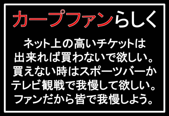 JUGEMテーマ:広島駅前の質屋さん (有)三益商事 おはようございます。 こんな劇的なプロ野球を見せてくれるカープには感謝してます。 カープを応援している側としてこれ以上ない展開を見せてくれてます。 皆の期待をいい意味で裏切ってくれた選手たちに、球場へ足を運んで礼 を直接言いたいです。しばらく無理ですが(笑) でも、首位返り咲きとなれば勿論チケット争奪戦が過熱します。 こうなるとネット上に出回る高いチケットに手を出すファンも多くなり ます。 こんな時だからこそ、カープファン...