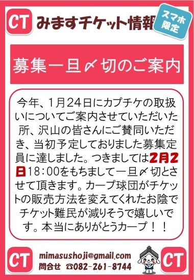 JUGEMテーマ:広島駅前の質屋さん (有)三益商事 こんばんは。 先ずは、この場をかりてお礼申し上げます。 先週、カプチケメンバーのご案内をさせていただいた後に多くの方から ご連絡をいただき、概ね予定していた定員になりました。 ですので、2月2日をもちまして一旦〆切とさせて頂きます。 カープ球団が、ファンの為にチケット販売方法を変更してくれたお蔭で チケット難民が減ってくれるのでは?と期待しております。 少しでも多くのファンが球場に足を運べるように祈ってます! ...