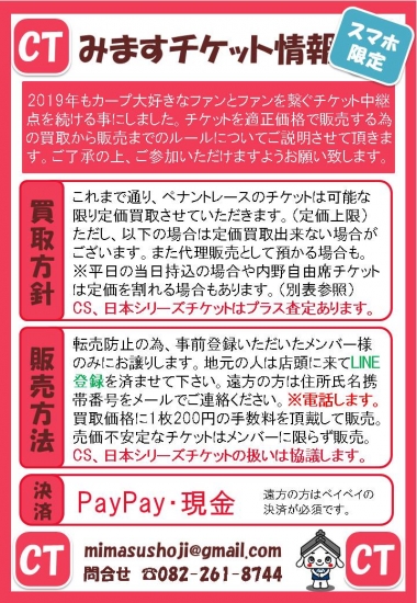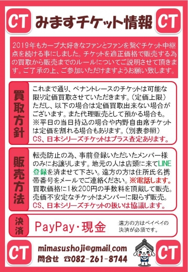 JUGEMテーマ:広島駅前の質屋さん (有)三益商事 おはようございます。 誠に申し訳ございません。 昨日、ご案内したカープチケットの取扱いの件で訂正がございます。 スマートフォンをお持ちの方限定でメンバー様を募集させて頂きます。 言葉足らずで申し訳ございませんでした。 出来るだけスムーズな取引を行えるようにする為です。 また、定員数に達しましたら〆切とさせて頂きます。 何卒よろしくお願い致します。