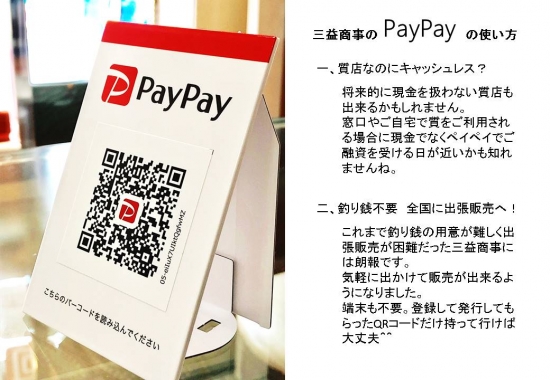 JUGEMテーマ:広島駅前の質屋さん (有)三益商事 すっかり朝晩が寒くなりましたね。 ですが・・・。 雪が降る気配を感じられません。 これはこれで困る訳でして、12月も目前に迫っていながらこの暖かさは 冬のスポーツを楽しむ者として少し心配になります。 神様早く寒くなってください! さて、先日のネタですがえらく気に入ったPAYPAYの話です。 ついにQRコードが届きました。 これで店舗に縛られない営業が出来る事になりました。 将来的には質屋も現金を置かないお店が増えるでし...