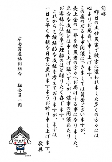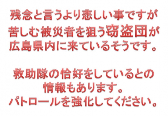 JUGEMテーマ:広島駅前の質屋さん (有)三益商事 こんにちは。 思っていた以上に悲惨な状況となってしまいました。 報道の在り方もそろそろ進化して欲しいものです。 悲惨な状況を伝えてくれるのは有難いですが、そもそも何でこうなった のか、自治体の在り方は問題なかったのか? 予算は適正に使われているのか? チェックして欲しいもんだ。 せめて4年前の教訓がどのように活かされたのか検証して欲しい。 偉い人頑張れ! 県民の為に! 大事なお知らせです。 こんな悲惨な状...