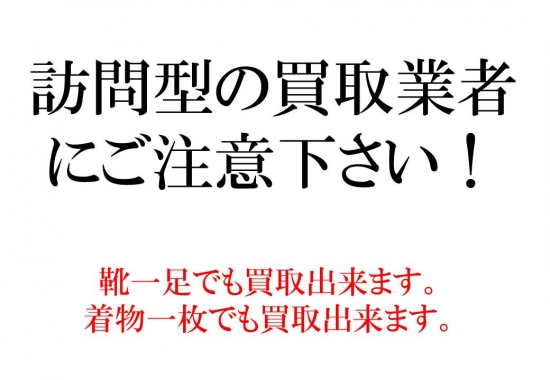 JUGEMテーマ:広島駅前の質屋さん (有)三益商事 おはようございます。 年末になると空き巣被害や振込み詐欺の被害が増えるようです。 被害に遭わないようにご注意していただきたいものです。 それからもう一つ、訪問型の買取サービスにもご注意して欲しいですね。 全ての業者さんが悪徳とは言いませんが、ご自宅に買取業者を招く際には 事前に確認するべき事があります。 ?買取ってもらう品物が無い場合に費用が発生するのか? 悪徳業者による訪問型の買取サービスでは、一定...
