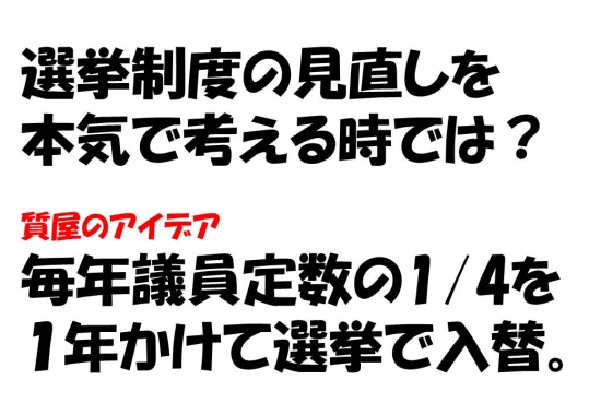 JUGEMテーマ:広島駅前の質屋さん (有)三益商事 こんばんは。 カープで燃え上がっている広島ですが、国政選挙も行われておりましてどち らも大切な行事でございます。 しかしながら、選挙と言うのは国民が向こう4年間の国の成り立ちを選択す めっちゃ大事な行事なのに2週間だけ叫んであっと言う間に終わります。 時間が足りないような気がします・・・。 でも、国会を長い間休ませるわけにいかない。 私、ひらめきました。 議員の1/4を毎年入れ替える選挙をすればいいと。 そうす...