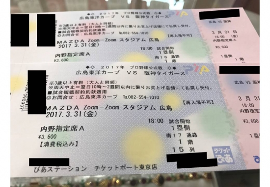 JUGEMテーマ:広島駅前の質屋さん (有)三益商事 こんにちは。 毎年、満開になると雨が降る気がしますが、気のせいなんでしょうね・・。 明日は晴れると良いですね! 昨日、カープの観戦チケットを買取りさせていただいたお客様から、一言い ただきました。 「ブログ見ました。定価以上で売らなくて良いですよ。」 嬉しいぃ〜。 これぞカープファンの男気でございます。 話を聞くと、カープチケットが完売と聞いているのに、ネットでは高額で売 られ、テレ...