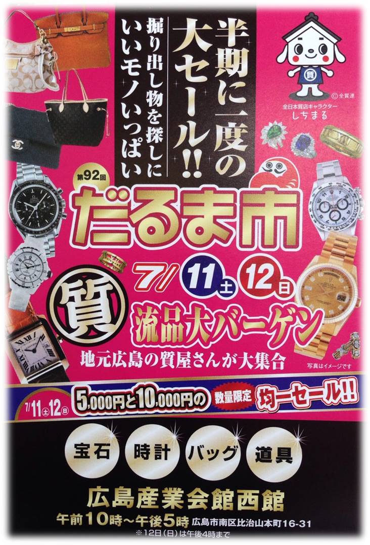 JUGEMテーマ:広島駅前の質屋さん (有)三益商事 おはようございます。 今日も蒸し暑い広島駅前からお得な情報をお届けしたいと思います。 明日より二日間。 いよいよ広島質屋協同組合主催の「だるま市大バーゲン」が開催します。 会場は広島産業会館西館でございます。 近年、中国人の爆買いで話題になっております、あの大バーゲンです。 ただし、広島では外国人向けの広告はまだ出しておりませんので比較的 静かにお買い物が出来るとおもいますよ。 目利きのプロ集団が自信をもって提供する数々の商品を是非眺めに...