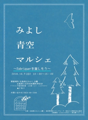 みよし青空マルシェに出店いたします♡ ▼▼▼▼▼▼ みよし 青空 マルシェ 〜Fabriquerを楽しもう〜 2018.10.7(日) 10:00〜15:00 開催場所 / 広島県立みよし公園 広島県三次市四拾貫神田谷 アクセス / 中国自動車動 三次東JCT・ICからすぐ ★P有り お問い合わせ / 0824-66-3366 主催 : 広島県立みよし公園 / 指定管理者ミズノグループ・星光ビル管理共同...