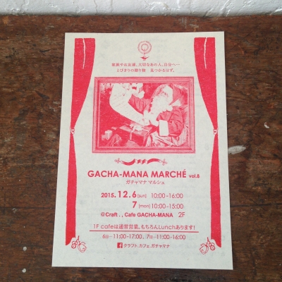 ▼▼▼▼▼▼▼▼▼▼▼ ▼▼▼▼▼▼▼▼▼▼▼ 2015.12.6[sun] 10:00〜16:00 12.7[mon] 10:00〜15:00 開催場所 Craft.,Cafe GACHA-MANA 2F 1Fカフェは通常営業 Lunchあります! 12.6(日) 11:00〜17:00 12.7(月)11:00〜16:00 広島市西区草津本町29-6{A} Tel 070-5057-0172 メール gacha-mana@willcom.com HP http://www.gacha-mana.com 店舗の斜め前に専用駐車場が2台ございます。 満車の場合は、近隣のコインパーキングをご利用下さい^^ ※全店クリスマスギフト用ラッピング...