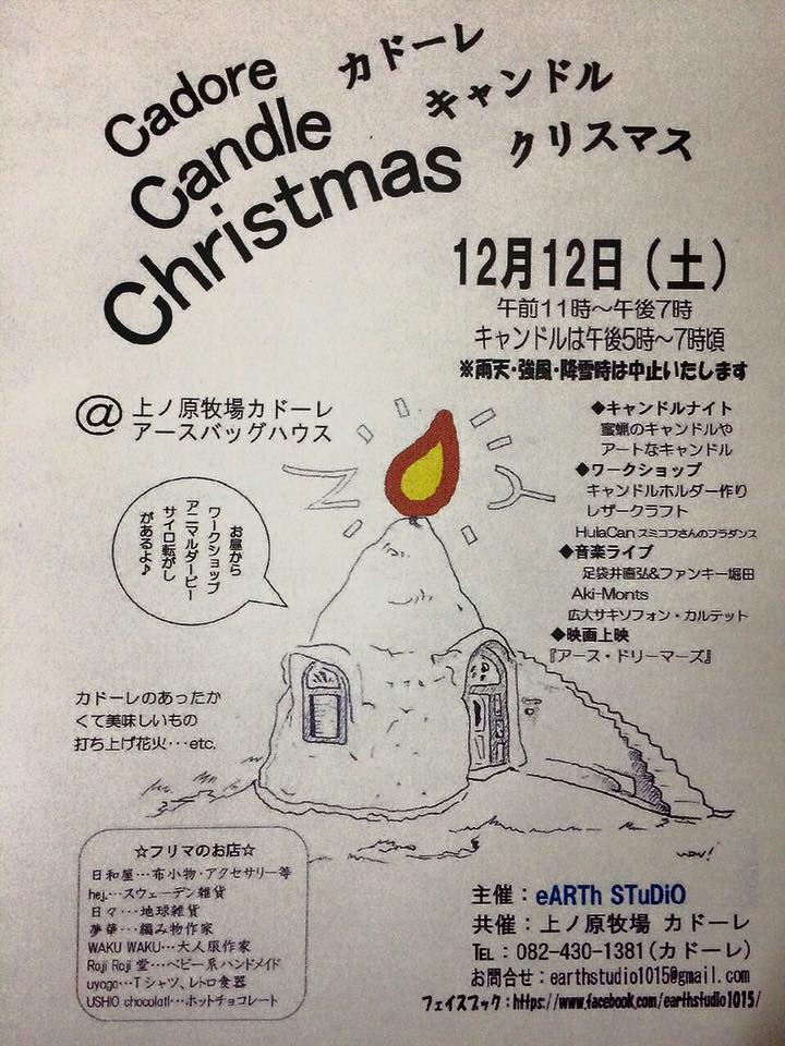 ▼▼▼▼▼▼▼▼▼▼▼ cadore candle Christmas カドーレ キャンドル クリスマス ▲開催日時 12月12日(土) 午前11時〜午後7時 キャンドルは午後5時〜午後7時頃 ※雨天・強風・降雪時は中止いたします ▲開催場所 上ノ原牧場カドーレ アースバックハウス http://www.cadore.jp ◆キャンドルナイト 蜜蝋のキャンドルやアートなキャンドル ◆ワークショップ キャンドルホルダー作り レザークラフト HulaCan スミコフさんのフラダンス ◆音楽ライブ 足袋井直弘&...