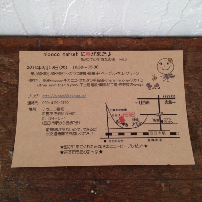 JUGEMテーマ:広島情報 ▼▼▼▼▼▼▼▼▼▼▼▼ ▼▼▼▼▼▼▼▼▼▼▼▼ nicoco market に春が来た♪ 1日だけの小さなお店 vol.6 に出店いたします(^o^)/ 前回!nicocoのハロウィンパーティー に初参加!初出店! nicocoさんのイベントに 今回も! 参加させていただく事に決まりました^^ 大人気の自宅shopイベント! 前回は、凄くたくさんのお客様にご来場いただいて ただただ!びっくりな一日でした(^o^)/ 人気作家さんのハンドメイド雑貨 どれも素敵です(^o^)/ 主催のチカニコさんのご自宅も とっ...
