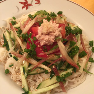 さて昨日は七夕という事で「ツナとトマトのぶっかけそうめん」をメニューに出しましたが、 (七夕にそうめんを食べる風習のある地域があるとかで) やはりそうめんって店ではあんまり食べないですよねー。 おうちのごはんですもんね。 という事で本日はメニューに出しておりませんが、 材料はあるので言われれば作れます。ぶっかけそうめん。 (本日の画像は全てクリックで拡大します)