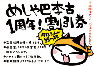 どうもこんにちは。ともえです。 何と明日4月13日で「めしや巴李古」は 1周年を迎えます。 ワー。パチパチ。よく1年もやったな…。 1周年に何をしようか色々考えたのですが、 4月13日の1日のみ、 「次回以降使える割引券」を配布する、 という事におさまりました。 (で、上がその「割引券」のデザインです。 本物はカラーではないので、 上のやつを印刷して持ってきても無効ですよ。)