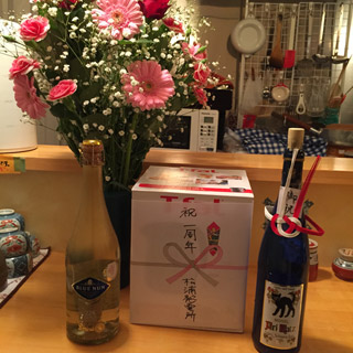 昨日は「めしや巴李古」1周年でした。 お祝いの品々を頂きましたので写真を撮ってみました。 ありがとうございます! お越し下さった皆様、本当に有難うございました。