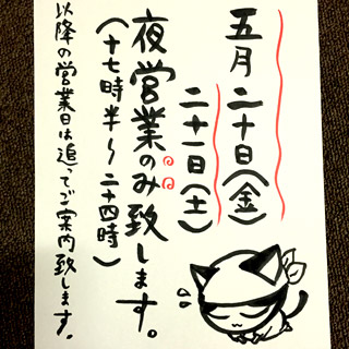今月20日(金)と21日(土)、 とりあえず夜営業のみですが再開致します。 本来21日は「第3土曜」なので開けないのですが、 先週の土曜開けられなかったので、代わりに営業致します。 体調回復しましたー! という訳では全然ない、ので、 これ以降の営業日は追ってご案内しようと思っております。 よろしくお願いいたします。