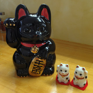 昨日はデザイン業のお話でしたので、本日は「めしや」ネタで。 本日は以前、委託販売でお世話になっていた 元「くろねこ屋」店長さんがお越し下さって、 開店祝いに招き猫をプレゼントして下さいました!! 「折角だから選んでもらおうと思って」と言って 4点持ってきて下さったのですが、 写真の黒猫と2匹が対になってるミニ招き猫で悩んでたら 両方プレゼントして下さいました…笑 別にそれを狙って悩んだ訳じゃないですよ!! ありがとうございます!!!