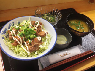 本日のどんぶり。 「鶏肉と春キャベツの照りマヨ丼」でした。 お味噌汁はカボチャと玉ねぎの味噌汁。 今日の小鉢は「きゅうりとミョウガの酢の物」 「きんぴらごぼう」を作りました〜。 (どんぶりには小鉢1皿しかつけないので、 きんぴらは撮影しませんでしたが) 日替り定食の「ささみ梅しそカツ」は 売切れちゃったので、写真撮れず…。 画像はクリックで拡大します。