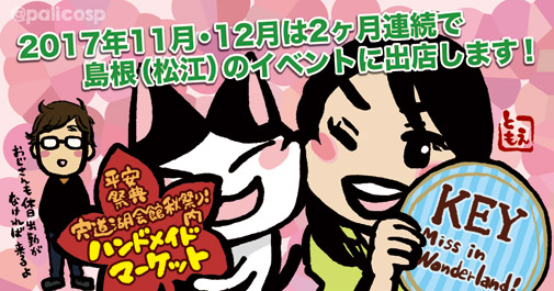 「地元のイベントにはなかなか出店できないんですよ〜」 が口癖だったわたくしですが、なんと! ご縁あって、11月・12月と2ヶ月連続で地元出店することになりました! 11月は 「平安祭典宍道湖会館秋祭り!内ハンドメイドマーケット」 12月は 「KEY Miss in Wonderland!」 に出店します! どちらも松江市内のイベント会場です。 詳細はこのあとすぐ!