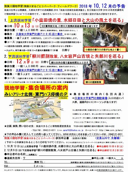 筑後川まるごとリバーパークモニターツアー2018 筑後川現地学習ツアー10,12月予告 1.上流現地学習 「小鹿田焼の里,水郷日田と大山の風土を巡る」 ●日時:10月13日(土) 日帰り ●募集:一般受講生4人まで ※雨天決行です。このツアーには他に学生が参加します。 ●コース:久留米大学9:00発→10:00高速道日田IC→小野川斜面崩壊豪雨被災地→ →小鹿田焼の里散策,資料館→12:00昼食(各自で)→三隈川のせせらぎ散策→ →大山ダム,柳又導水路→日田IC→久留米大着解散17...