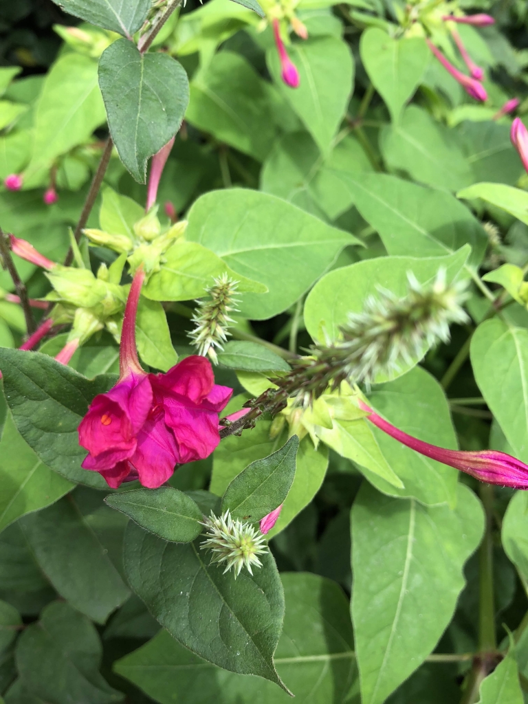 小さな種子を割ると中から真っ白な粉が出てきます この粉がおしろい(白粉)に似ていることから「オシロイバナ」 女の子はこの粉をおしろいのように使ったお化粧遊びをするそうですが 男の子はもっぱらこの花を落下傘に仕立て遊んでいました 花を緑色の根元からポキッと取り、その根元(子房)に繋がっている雌しべが切れないよう そ〜っと花筒からある程度まで引き抜きます それを高い位置から落とすとちょうど子房が重しとなり、花びらが落下傘の傘の役割を果たし クルクルクルクルと回りながら落ちていきます 根っ...
