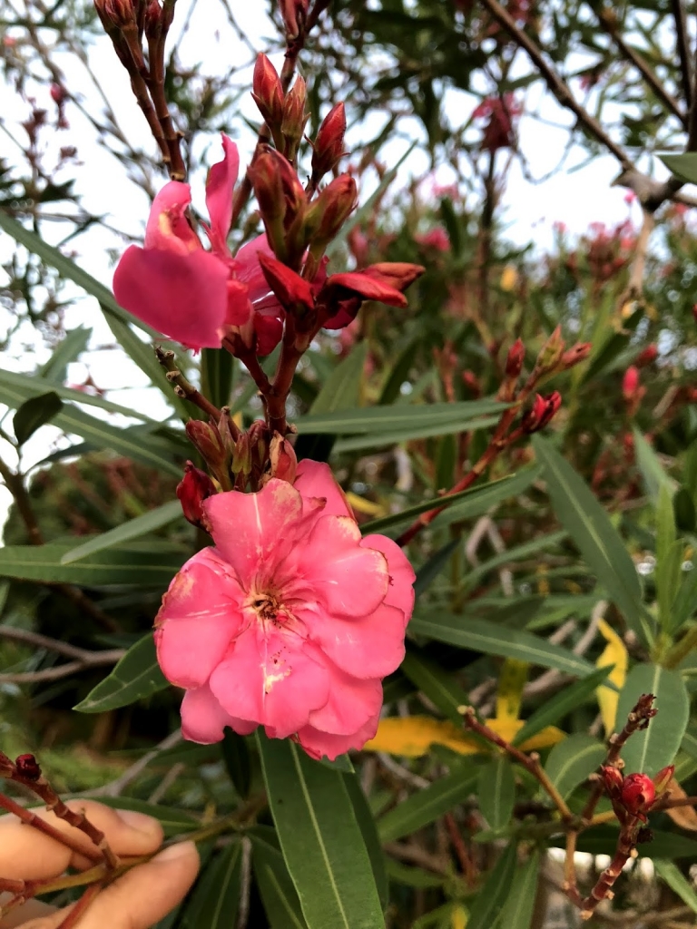 この猛暑と日照り続きで、多くの植物が疲弊するなか 最近、通勤途中の道すがらや散歩する公園わきで この花が咲き乱れているのをよく目にするようになりました 葉が竹の葉に似ていて、花は桃の花に似ているので「夾竹桃」 何となく雅な名前とは裏腹に、葉も花も木も 植わっている土壌も猛毒だそうです ついでに生木を燃した煙さえ毒成分があるらしい.. 夏の暑さを生き抜くには、それくらいタフでなければ ということなのでしょうか 植えられた場所が霊園や公園の外周に多いのは 環境に強く、害獣除けにも利用されている...