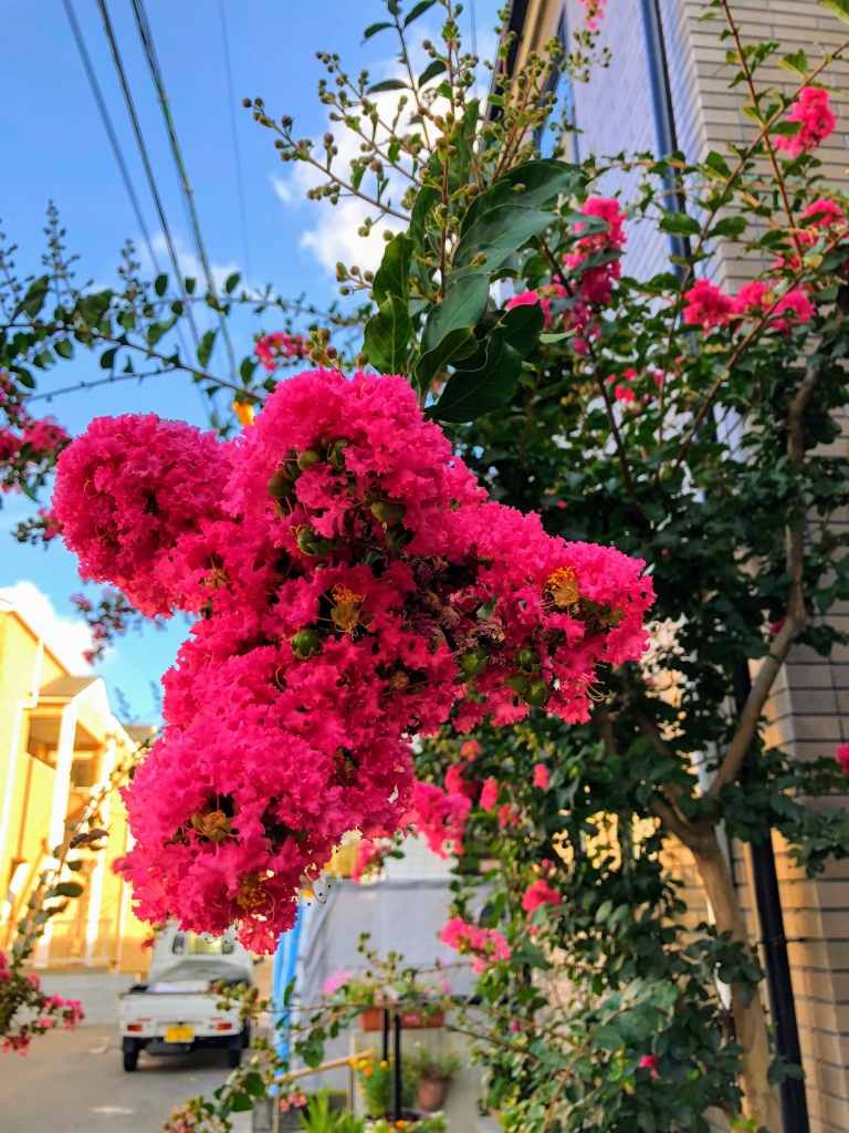 夏の花というと、向日葵だったり朝顔だったりといろいろあるなかで 絢爛豪華な咲きっぷりでいくとやっぱりこの花でしょうか 百日紅(サルスベリ) 名前の印象からツルツルした樹肌なんだろうなぁというくらいの認識で 長い間名前は知っていても実際にどの木を指すのか知りませんでした しかもこんな花を咲かせるなんて.. 目にしてはいたのだろうけど、ずっと素通りしていたんですね 意識して見ることの大切さを改めて感じました この花が終わる頃、暑かった夏もそろそろ終わりを迎えます JUGEMテーマ:福...