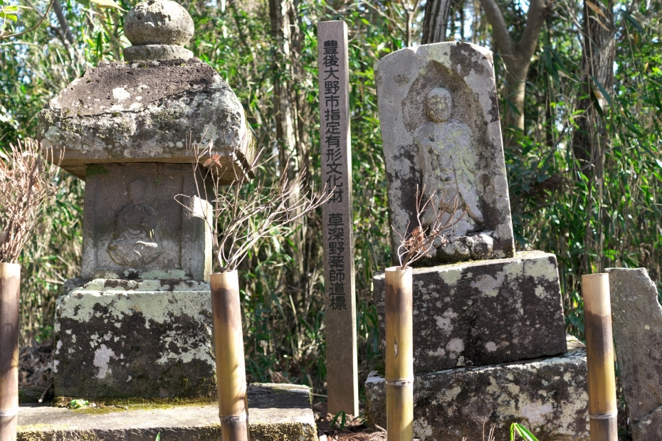 JUGEMテーマ:大分県豊後大野市 JUGEMテーマ:豊後大野市緒方町 昨日はお昼過ぎまで曇りで少しだけ寒さを感じましたが、一時過ぎた頃から太陽が薄い雲の間から顔を出し始め気温は20度くらいまで上がったでしょうか。 そして大野町の浅草八幡ではお祭り、その様子は後日ご報告するとして。。。 さて昨日ご紹介した一里塚を見つけられたのは、この文化財に巡り会えたからです、本当に探し回りました(^-^; 右にあるのが道標です、現在では近づいて見ないとお地蔵様にしか見えません(笑) 総高1.11m、草深野の近世岡...