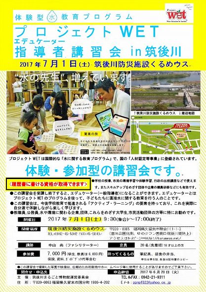 体験型”水”教育プログラム 「プロジェクトWETエデュケーター講習会in筑後川」 川の指導者になりたい方、参加者募集中! ●プロジェクトWETは国際的な「水に関する教育プログラム」で、国の「人材認定等事業」に登録されています。 子どもたちが水のことを楽しく学ぶために開発された体験型のプログラムで、この講習会を受講し終了すると、エデュケーター(一般指導者)となり履歴書にも書ける資格が取得できます。 エデュケーターとはプロジェクトWETのプログラムを使って、子どもたちに直接水に関する...