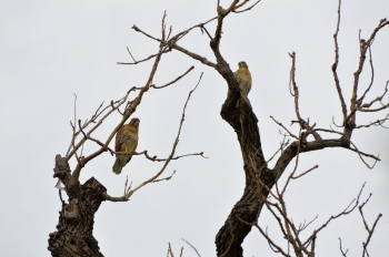 ボブキャットやコヨーテが時々出て来ます。都会でもグリーンベルトが多く自然と共存しているアメリカの住宅地。週末の朝二日続けてキー キーと大きな鳴き声で目覚めました。鳥?どっかのペット?犬の散歩帰りに上空を見上げるとそこにいたのは大きな つがいのかなり大きな鷹でした。望遠で みてみるとこちらを ガン見!こわーーい。樹齢百年以上ある大木の枯れたてっぺんにいました。日本の都会ではあまり 見かけることはないと思ったので写真を アップしてみましたよ!どういう種類でしょうか?アカオノスリ(赤尾鵟...