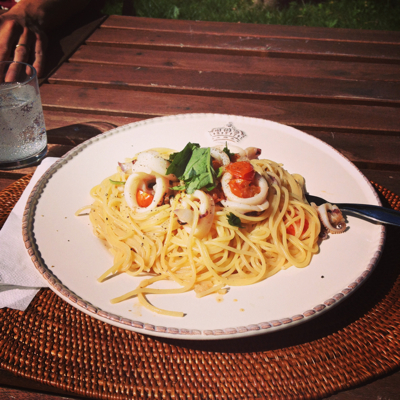 今日は本当に気持ちのいいお天気だったー。空もこれでもか!ていうくらい真っ青。朝は市場で魚とオーガニック市場で野菜をたくさん買ったけど、今日は込んでいたなぁ。家に帰って急いでランチの用意。今日はあんまり気持ちがいいから、庭でランチです!ついに庭でゆっくりお昼食べれる季節が来たー。そういえば、去年もこれくらいの季節からほぼ毎日庭でご飯食べてたな。市場で買ったイカで、ミニトマトとバジルのシンプルなパスタ。こういうシンプルなのが一番いい。この後は出張寿司教室に行ってきました。そして、今日はお知...