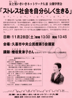 JUGEMテーマ:講演会のお知らせ オリーブの会単独の主催・又は久喜市の女と男いきいきネットワーク久喜に関連した講演会開催のお知らせです。 先ず 11月28日(土)13:45〜久喜市中央公民館第5会議室 「ストレス社会を自分らしく生きる」講師:檜垣貴津子です。 12月5日(土曜日)14時〜ふれあいセンター久喜視聴覚室 「あなたは本当の戦争を知っていますか?」〜ルワンダの内戦から逃れて〜 講師:トワリ・マリールイズさん 2月13日(土)14時〜ふれあいセンター久...