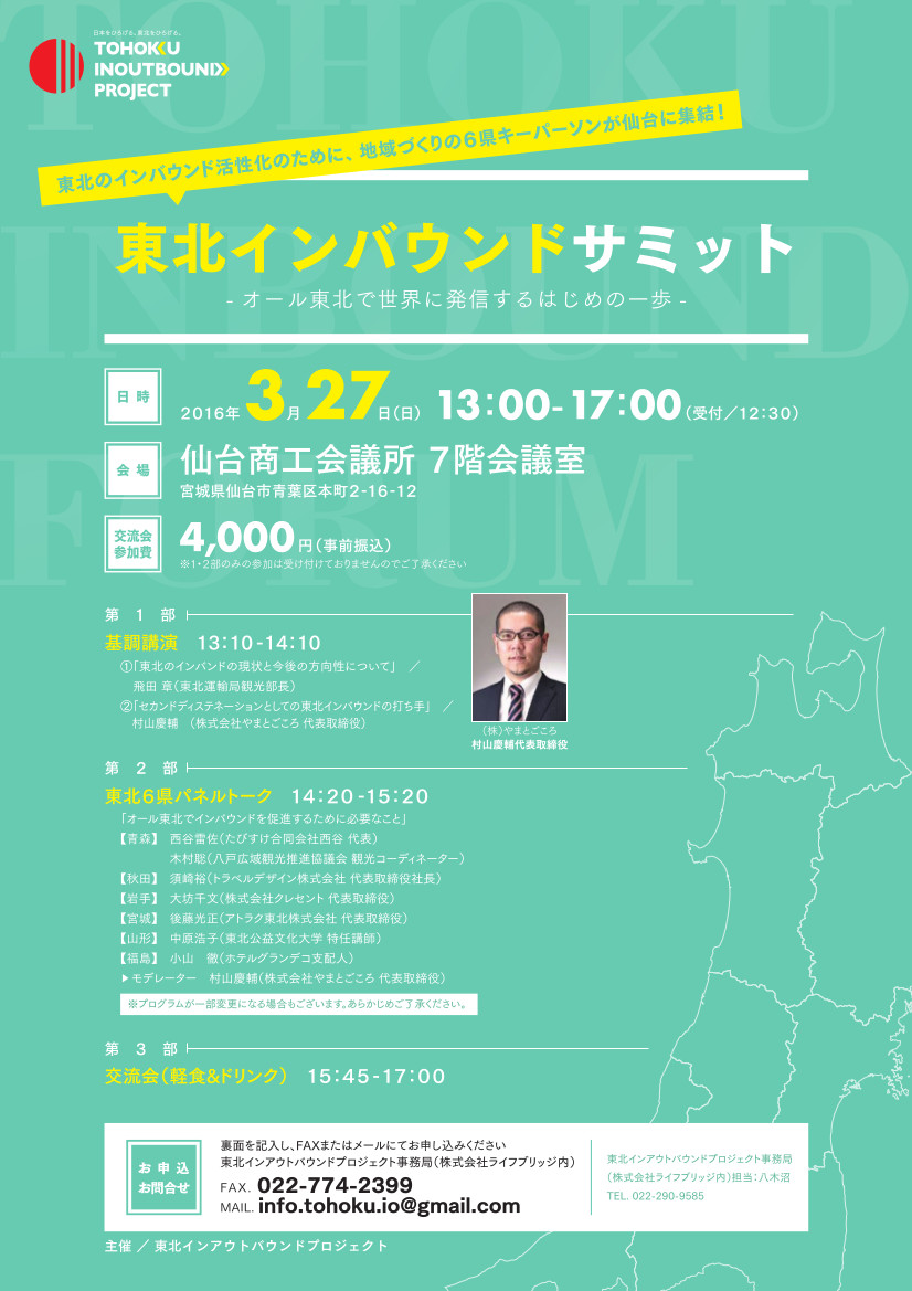 HPからですとより見やすいです ↓ http://www.lifebridge.jp/alltohoku.html ・〜・〜・〜・〜・〜・〜・〜・〜・〜・〜・〜・〜・〜・〜・〜・〜・ 【3月27日】仙台に東北のインバウンドのキーパーソン7人が集結! インバウンド大旋風が巻き起こる予感!?!!! みなさんこんにちは。 突然ですが、今月の27日のご予定はいかがでしょうか……? まだ特に予定の無い方(いやこの際すでに予定がある方も!笑)へ、 ビッグなイベントへのご招待をいたします。 その名も「東北...