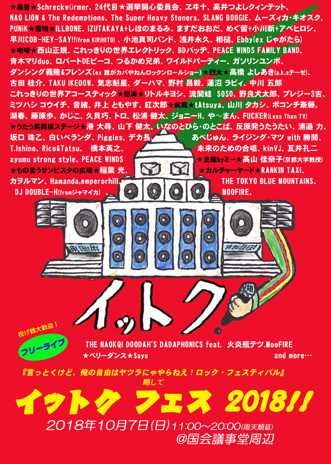 JUGEMテーマ:ライブ告知 イットクフェス 2018 2018年10月7日 11:00−20:00 国会議事堂周辺 小池真司バンド 16:30−17:00 と めぐ留+アベヒロシ+小川新 19:30−20:00 の二組で出演します。