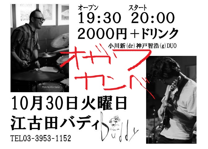 JUGEMテーマ:ライブ告知 2108年11月30日火曜日 江古田バディ 神戸智浩(g) 小川新(dr) open19:30 start20:00 2000円+ドリンク 即興演奏です。 僕としては、かなり定期的に演っている 神戸君とのDUOです。 色んな所で書いたり、言ったりしてますが、 僕は高校生でドラム始めてから、というより 友達とバンドやりたくてドラム始めた、という方が正しいのですが ずーっと、バンドの為にドラムをや...